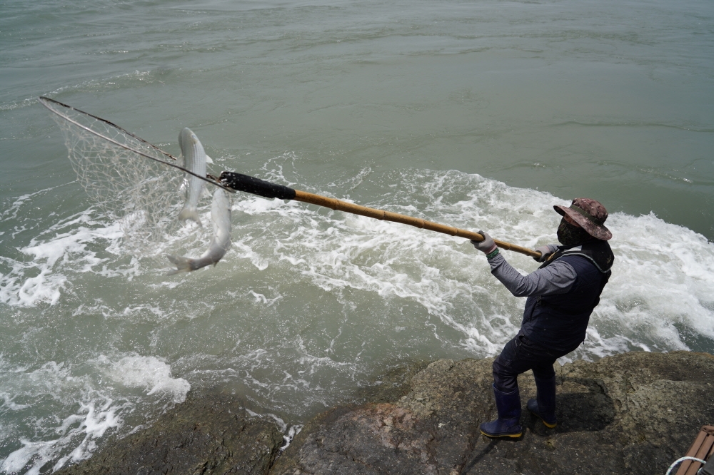 관람객들은 안전을 위해 갯바위 위쪽에 조성된 데크에서 뜰채 숭어를 잡는 모습을 볼 수 있다.