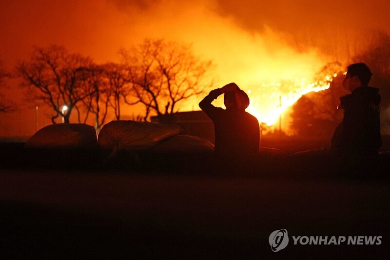 | ▲  Residents watch wildfires spreading to a nearby hillside in Andong, about 190 kilometers southeast of Seoul, on March 25, 2025. (Yonhap) |