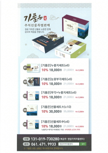 영암지역자활센터는 근로 능력이 있는 저소득층에 일자리를 제공, 스스로 자립 및 탈빈곤 할 수 있도록 기능습득 지원 및 근로 기회 제공을 하는 곳으로 이번에 추석을 맞아 자활센터가 준비한 추석선물세트로는 누룽지, 눈꽃부각, 타래과 3종으로 개당 3천500원, 세트(6개입) 1만8천원으로 특별 할인 판매하고 있다.