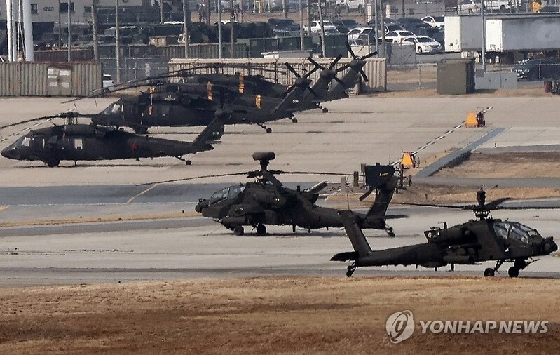 | ▲ Military helicopters prepare to take off at the U.S. Forces Korea's Camp Humphreys in Pyeongtaek, about 60 kilometers south of Seoul, in this file photo taken March 10, 2025, as South Korea and the United States kicked off their annual springtime Freedom Shield exercise. (Yonhap) |