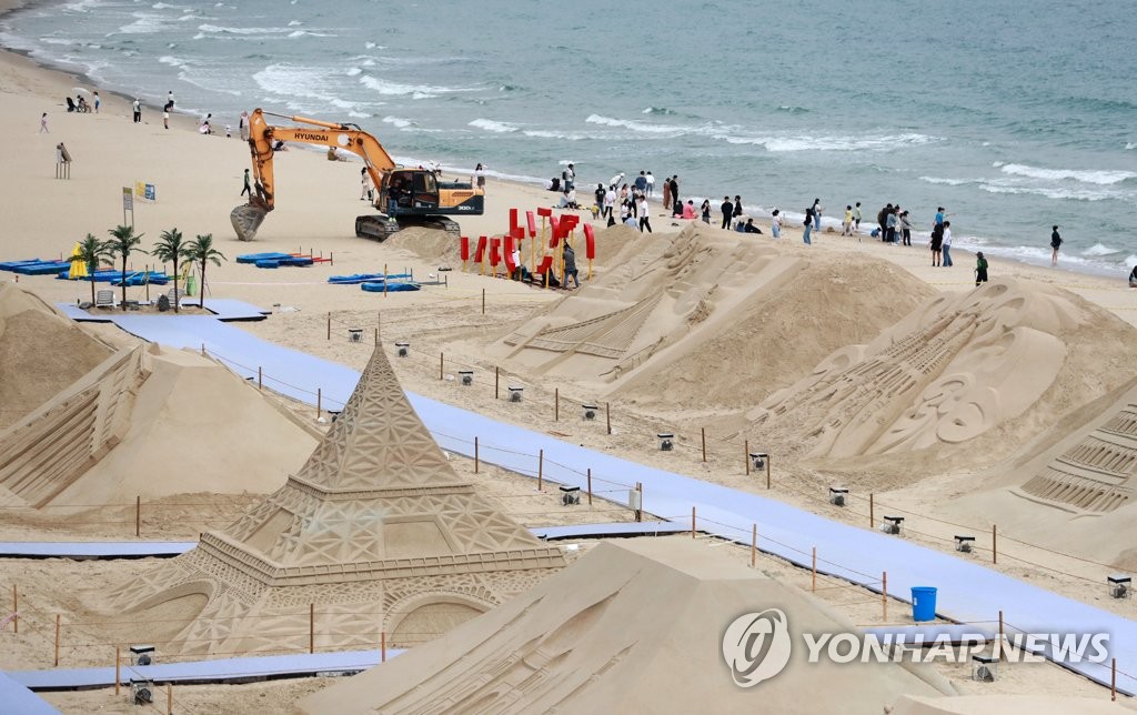 | ▲ 해운대 모래축제 D-1 (부산=연합뉴스) 손형주 기자 = 19일 오후 부산 해운대해수욕장에 모래 작품이 설치되어 있다. 해운대 모래축제는 '모래로 만나는 세계여행'을 주제로 20일부터 23일까지 열린다. 2022.5.19 handbrother@yna.co.kr |