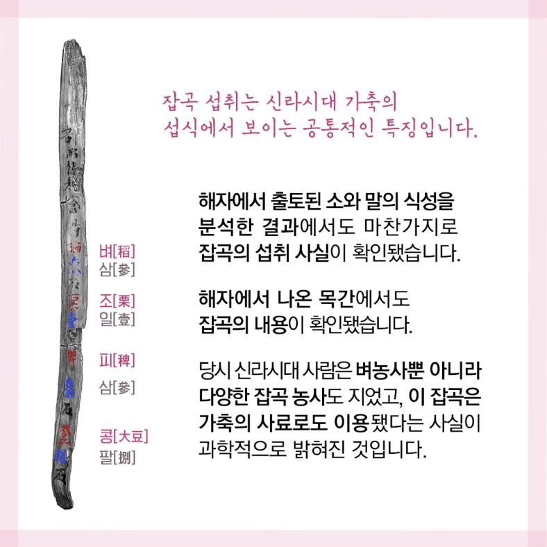 당시 신라 시대 사람은 벼농사뿐 아니라 다양한 잡곡 농사도 지었고, 이 잡곡은 가축의 사료로도 이용됐다는 사실이 과학적으로 확인된 것입니다.