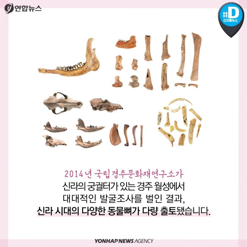 2014년 국립경주문화재연구소가 신라의 궁궐터가 있는 경주 월성에서 대대적인 발굴조사를 벌인 결과, 신라 시대의 다양한 동물 뼈가 다량 출토됐습니다.