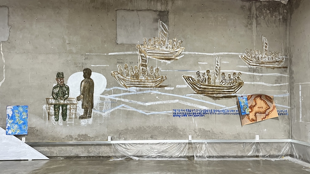 (신안=연합뉴스) 조근영 기자 = 전남 신안군은 내년 암태소작항쟁 100주년을 앞두고 서용선 작가와 함께 옛 암태농협창고에 암태소작항쟁의 역사를 예술작품으로 기록하는 독특한 작업을 시작했다.