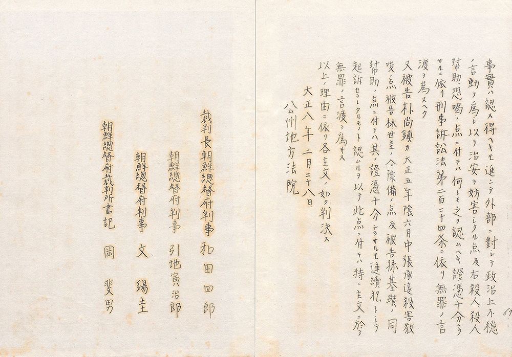 | ▲ 박상진 의사 공주지방법원 판결문 [고헌박상진의사 추모사업회 제공. 재판매 및 DB 금지] |