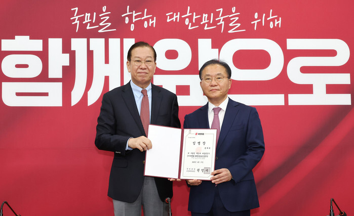 Kwon Young-se (L), chief of the conservative People Power Party's emergency leadership committee, poses for a photo with Yun Jae-ok, a lawmaker of the party and named as the party's preparatory committee head for the June 3 presidential election, after presenting Yun with a letter of appointment at the National Assembly in Seoul on April 17, 2025. (Yonhap)