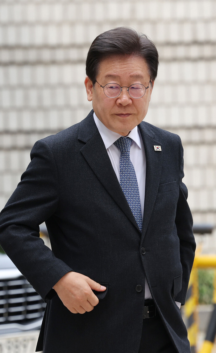 Lee Jae-myung, leader of the main opposition Democratic Party, arrives at the Seoul Central District Court in Seoul on April 30, 2024, to attend a hearing regarding corruption accusations against him in realty projects while serving as Seongnam mayor in the mid-2010s. (Yonhap)