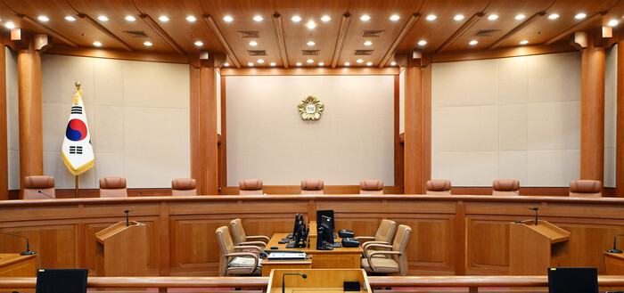 This photo, taken April 3, 2025, shows justices' seats inside the courtroom at the Constitutional Court in Seoul, where the court will hand down a decision at 11 a.m. the next day on whether to remove impeached President Yoon Suk Yeol from office or reinstate him over his brief imposition of martial law in early December. (Pool photo) (Yonhap)