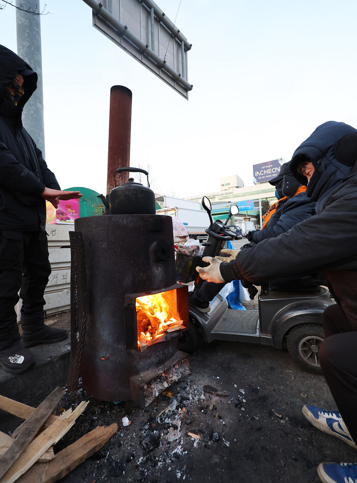 Shopkeepers warm themselves over a wood-burning stove at an agricultural wholesale market in Incheon, west of Seoul, on Dec. 3, 2025, as a spell of cold weather hits South Korea, with the mercury dropping to minus 8 C in the region. (Yonhap)