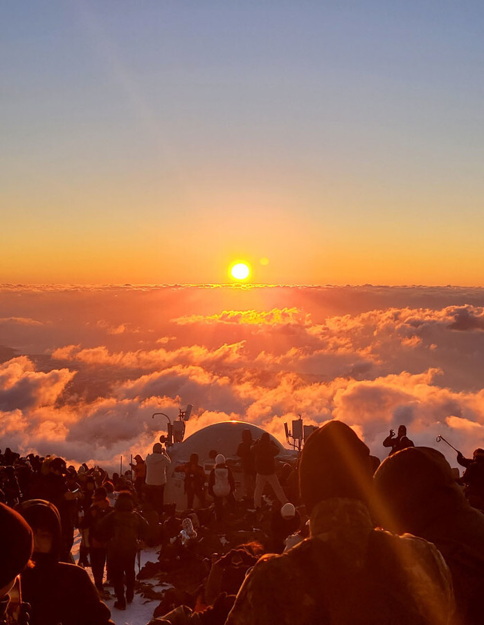 New Year's 1st sunrise Climbers look at the year's first sunrise near Baekrokdam Lake at the top of the 1,950-meter Mount Halla on South Korea's largest island of Jeju on Jan. 1, 2025. (Yonhap)(END)