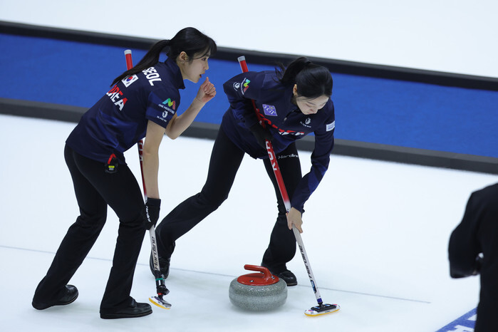 Seol Ye-eun (L) and Kim Min-ji of South Korea sweep the ice during the team's round-robin match against Canada at the LGT World Women's Curling Championship at Uijeongbu Indoor Ice Rink in Uijeongbu, northeast of Seoul, on March 19, 2025. (Yonhap)