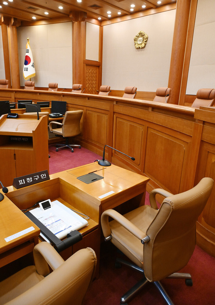 This photo, taken April 3, 2025, shows the respondent's seat inside the courtroom at the Constitutional Court in Seoul, where the court will hand down a decision at 11 a.m. the next day on whether to remove impeached President Yoon Suk Yeol from office or reinstate him over his brief imposition of martial law in early December. (Pool photo) (Yonhap)