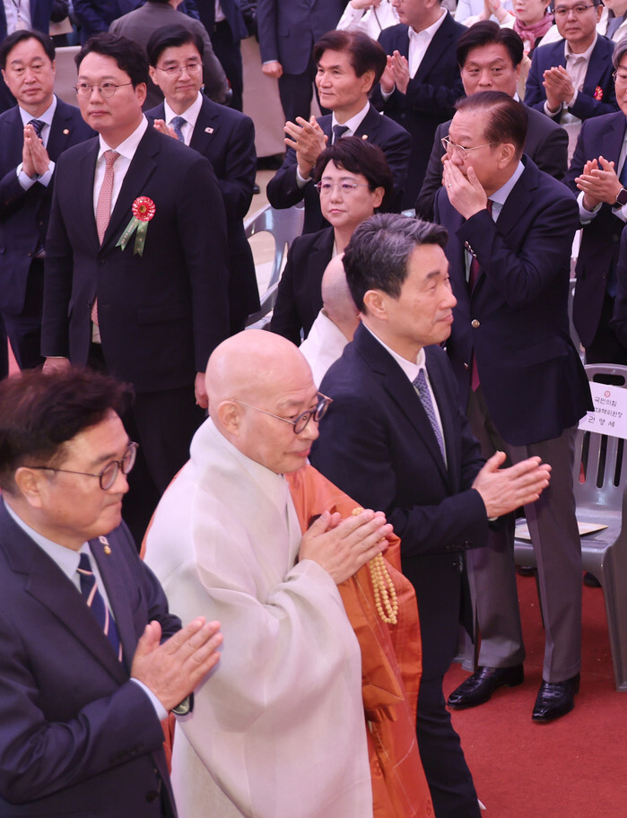 Acting President Lee Ju-ho (C), Ven. Jinwoo (C), chief of the Jogye Order, South Korea's largest Buddhist sect, and National Assembly Speaker Woo Won-shik (L) attend an event celebrating Buddha's birthday at Jogye Temple in Seoul on May 5, 2025. (Yonhap)