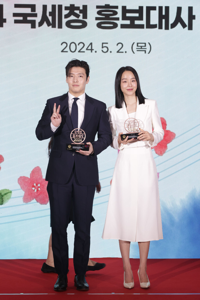 South Korean actor Kang Ha-neul and actress Shin Hye-sun pose for a photo during a ceremony in Seoul on May 2, 2024, to mark their appointment as a promotional ambassador for the National Tax Service. (Yonhap)