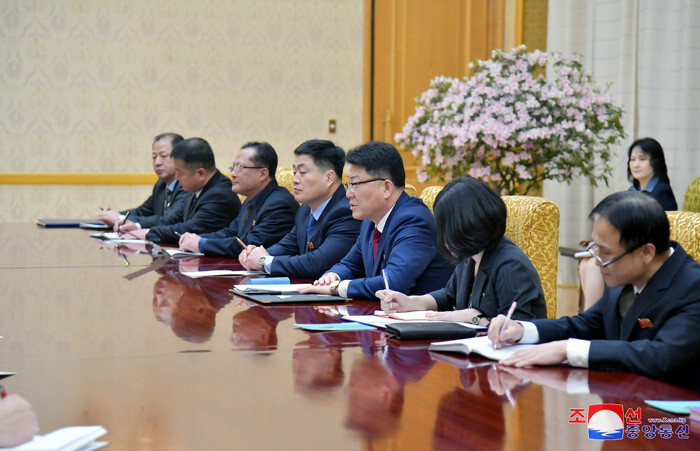 This photo, released by North Korea's official Korean Central News Agency, shows the North's External Economic Relations Minister Yun Jong-ho (3rd from R) speaking during talks with Administrative Gov. Oleg Kozhemyako of Russia's Maritime Territory at the Mansudae Assembly Hall in Pyongyang on March 19, 2024. (For Use Only in the Republic of Korea. No Redistribution) (Yonhap)