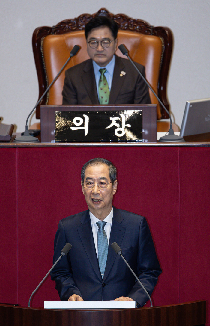 Acting President and Prime Minister Han Duck-soo delivers a speech during a plenary session of the National Assembly in Seoul on April 24, 2025, to ask lawmakers to approve a government-proposed supplementary budget of 12.2 trillion won (US$8.6 billion) aimed at protecting people from natural disasters and supporting businesses hit by an escalating trade war. (Yonhap)