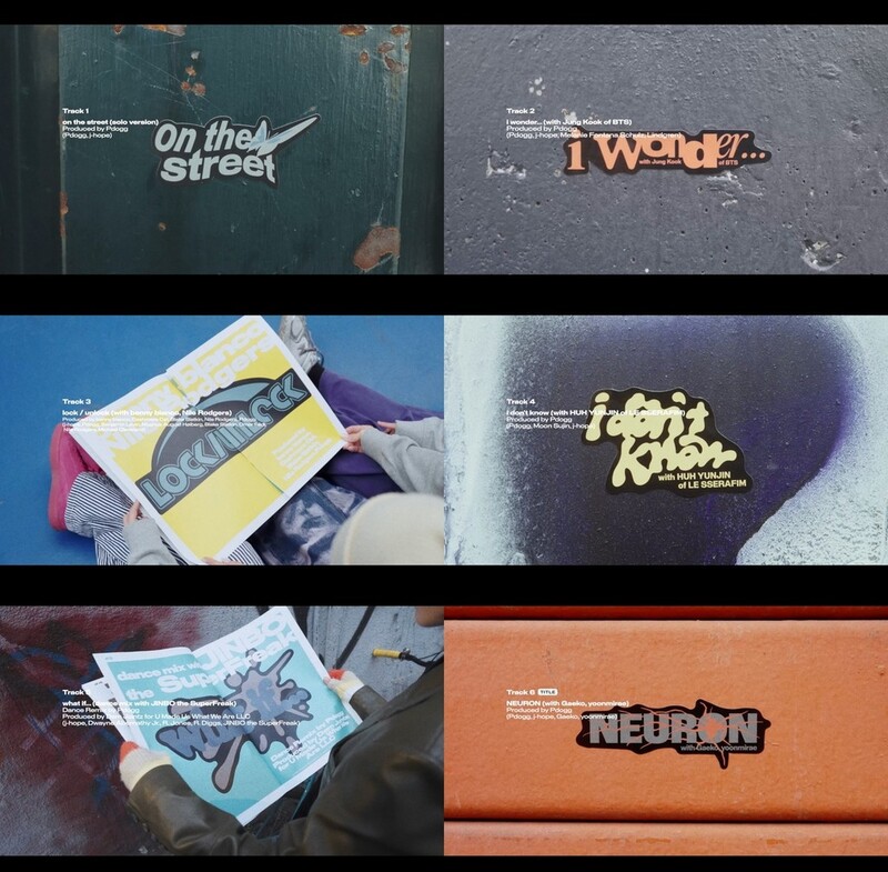 Also among the six tracks are "I Wonder...," an electro-funk number dedicated to his fans and featuring bandmate Jungkook; "I Don't Know" featuring Le Sserafim's Yunjin; "Lock/Unlock" featuring American producers Benny Blanco and Nile Rodgers; "On the Street (Solo Version)," and a dance remix version of "What If...," originally included in J-Hope's solo album released in 2022.