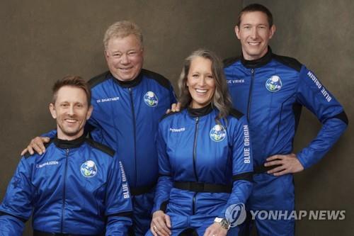 | ▲ 우주여행에 나서는 스타트렉 커크 선장 역의 윌리엄 섀트너(왼쪽에서 두 번째) (로스앤젤레스 AP=연합뉴스) 12일(현지시간) 블루 오리진이 공개한 사진에서 윌리엄 새트너가 우주여행에 앞서 동료 탑승객과 함께 포즈를 취하고 있다. 2021.10.13. [블루 오리진 제공. 재판매 및 DB 금지] photo@yna.co.kr |
