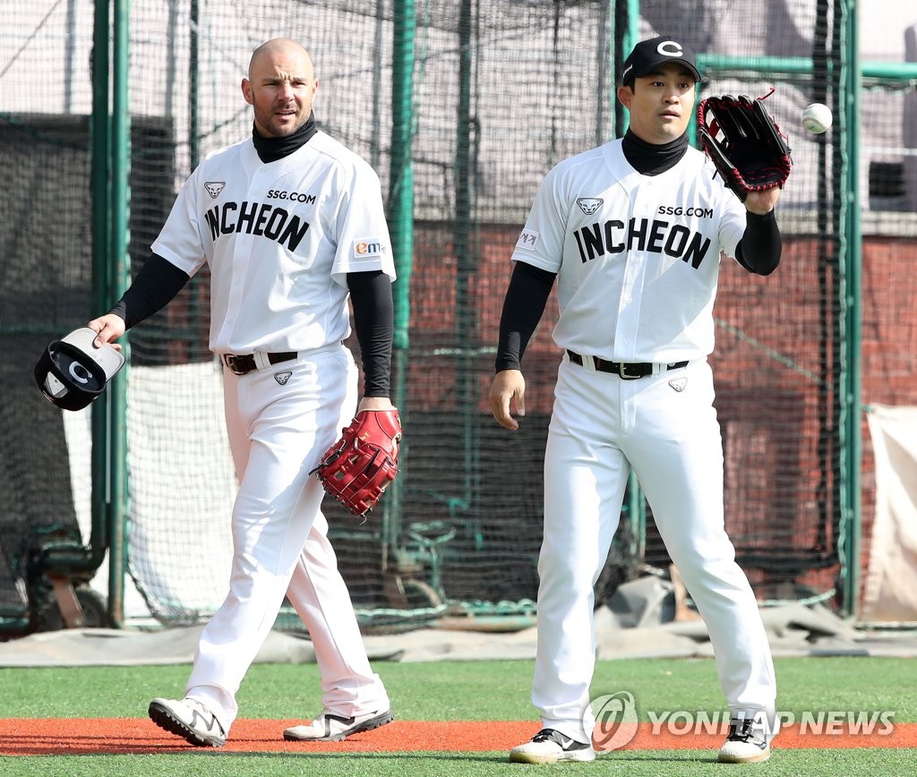 | ▲ Jamie Romak of the SSG Landers (L) and teammate Jung Eui-yoon train at Happy Dream Park in Incheon, 40 kilometers west of Seoul, on March 8, 2021, in this photo provided by the Landers. (PHOTO NOT FOR SALE) (Yonhap) |