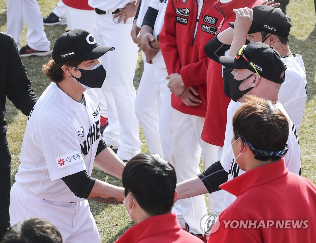 | ▲ Choo Shin-soo of the SSG Landers (L) shakes hands with his teammate Jamie Romak at Sajik Stadium in Busan, 450 kilometers southeast of Seoul, on March 11, 2021. (Yonhap) |
