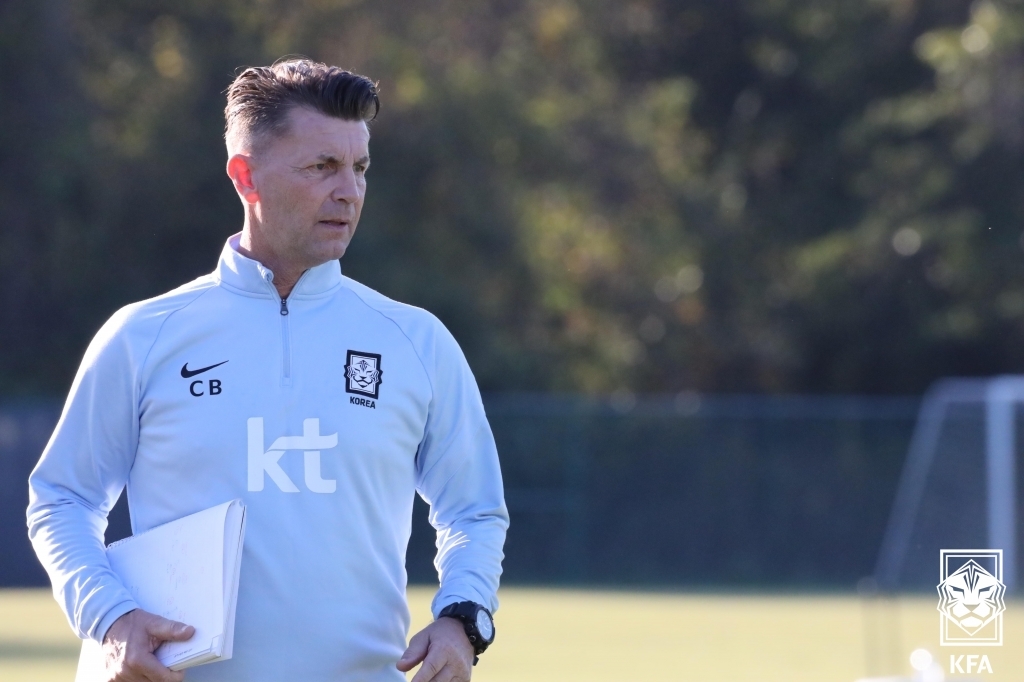 | ▲ This Oct. 21, 2021, file photo provided by the Korea Football Association shows Colin Bell, head coach of the South Korean women's national football team, during a training session at Children's Mercy Park in Kansas City, Kansas. (PHOTO NOT FOR SALE) (Yonhap) |
