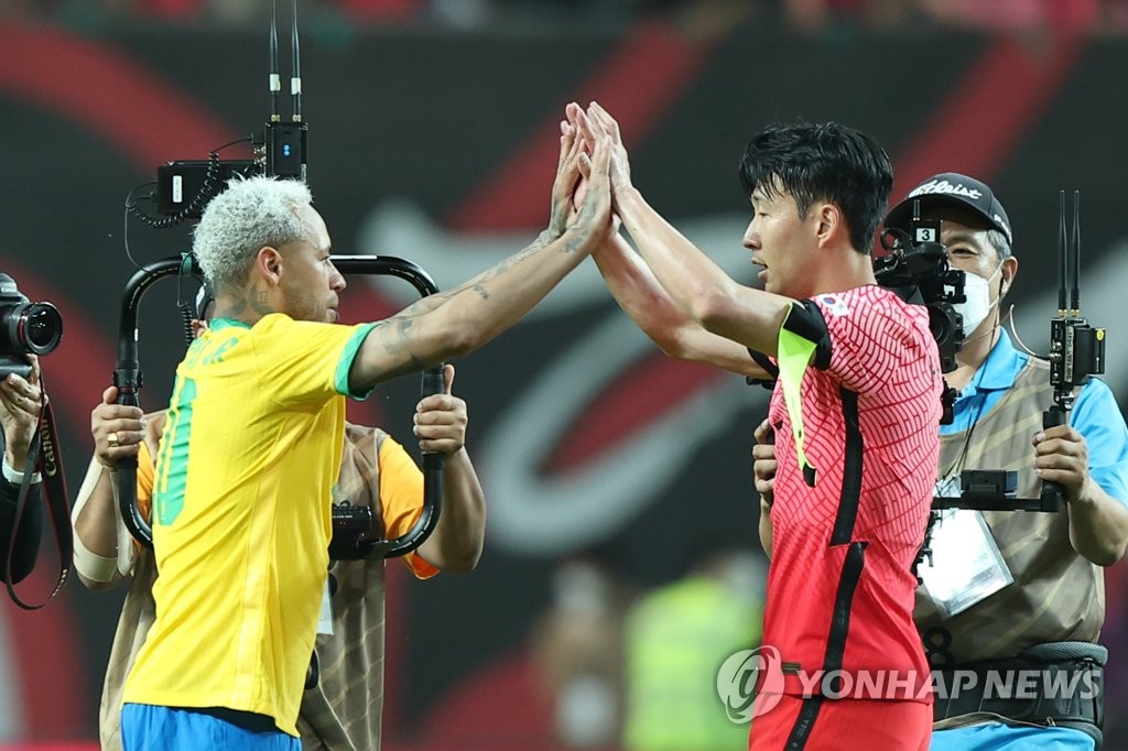 | ▲  In this file photo from June 2, 2022, Son Heung-min of South Korea (R) high-fives Neymar of Brazil after Brazil's 5-1 victory in a men's football friendly match at Seoul World Cup Stadium in Seoul. (Yonhap) |