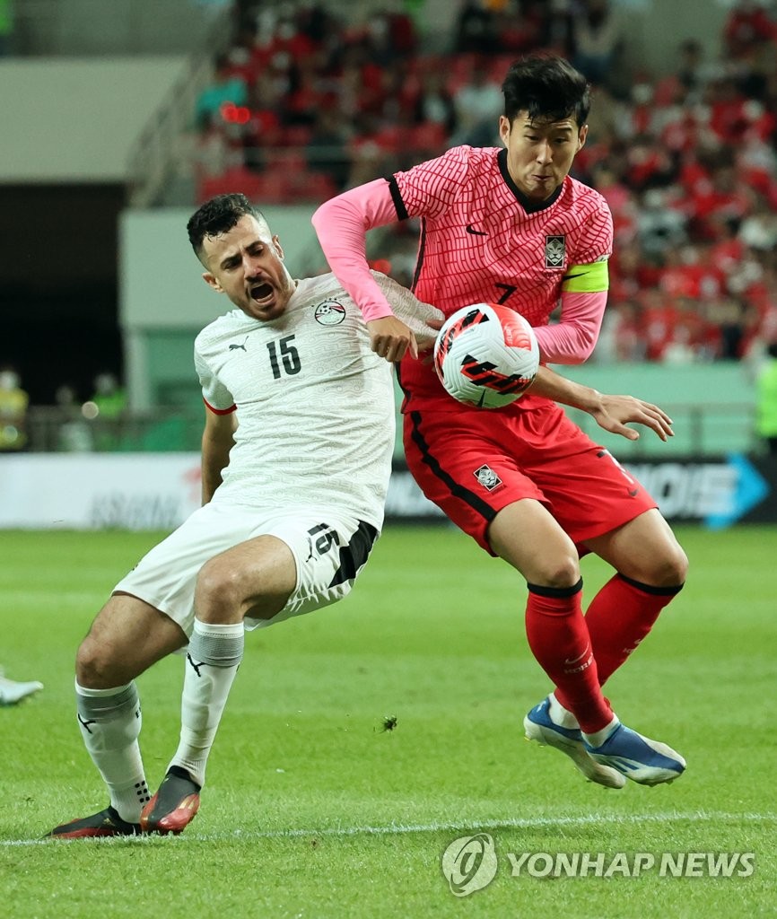| ▲  Son Heung-min of South Korea (R) tries to get past Mahmoud Hamdy of Egypt during the countries' friendly football match at Seoul World Cup Stadium in Seoul on June 14, 2022. (Yonhap) |