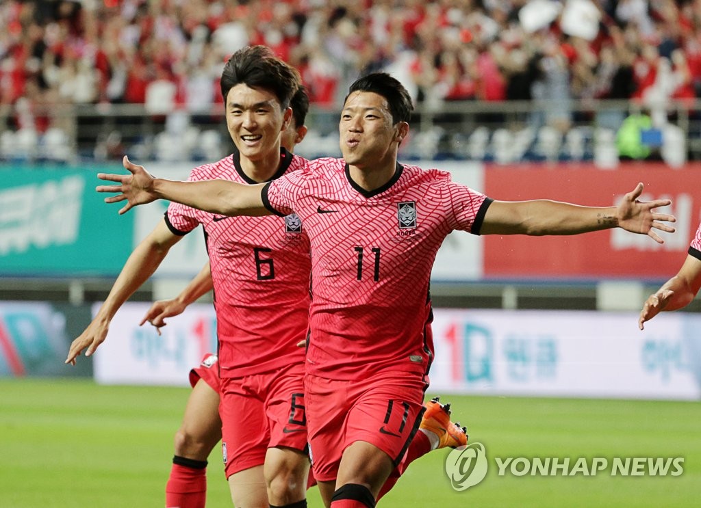 | ▲  In this file photo from June 6, 2022, Hwang Hee-chan of South Korea (R) celebrates after scoring a goal against Chile during the countries' friendly football match at Daejeon World Cup Stadium in Daejeon, 160 kilometers south of Seoul. (Yonhap) |