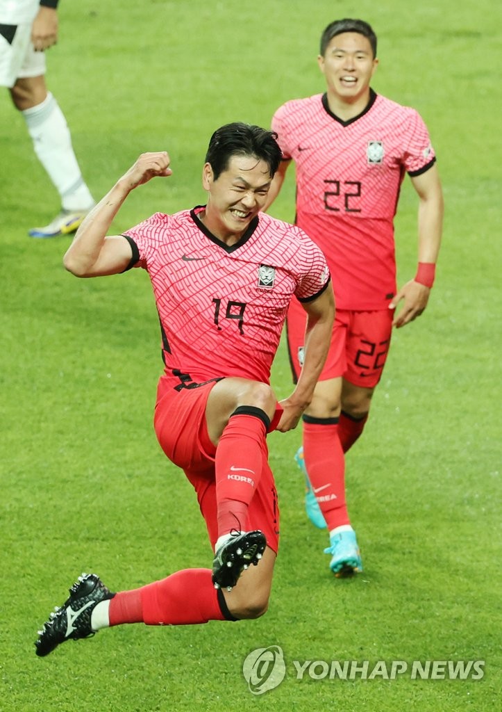 | ▲  Kim Young-gwon of South Korea celebrates after scoring a goal against Egypt during the countries' friendly football match at Seoul World Cup Stadium in Seoul on June 14, 2022. (Yonhap) |