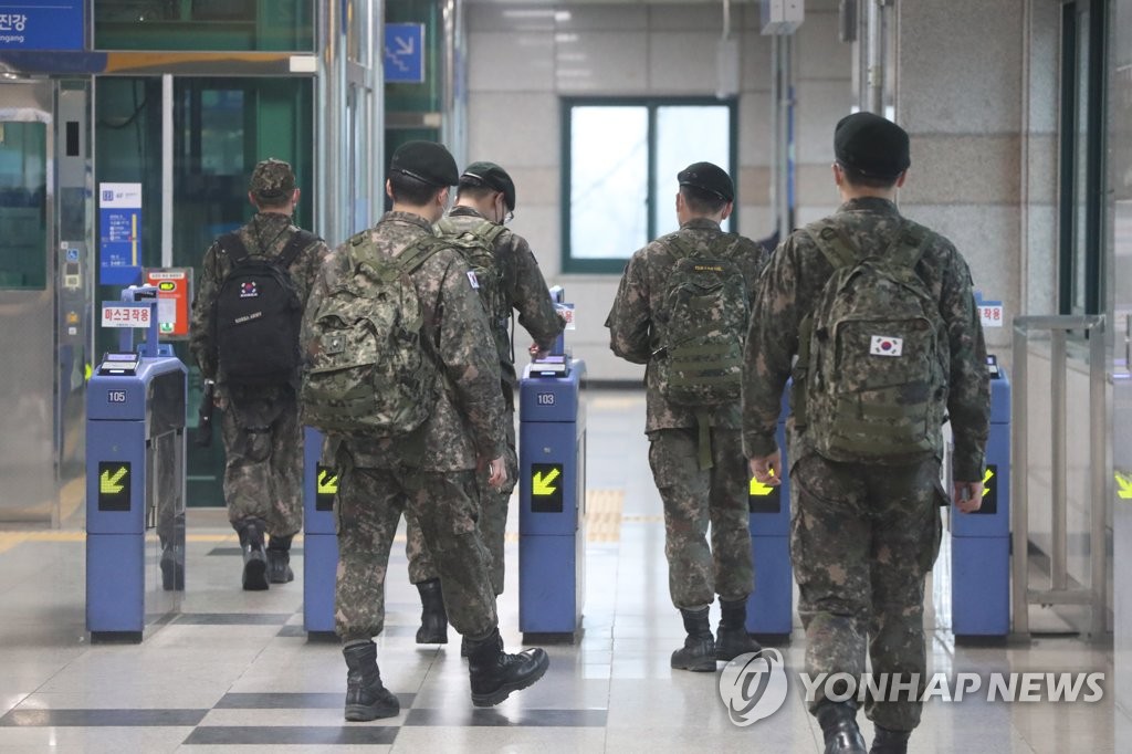 | ▲ Soldiers enter Munsan Station in Paju, north of Seoul, on Feb. 15, 2021, as the defense ministry lifted a monthslong restriction on military leave the same day in accordance with the easing of the government's social distancing rules against COVID-19. (Yonhap) |