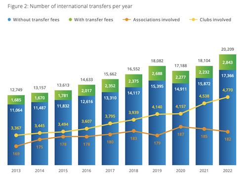 국제축구연맹(FIFA)이 27일(한국시간) 발표한 '2022년 세계 이적시장 보고서'에 따르면 지난 한 해 남자 프로선수의 국가 간 이적 건수는 2만209건으로 사상 처음으로 2만건을 넘어섰다.