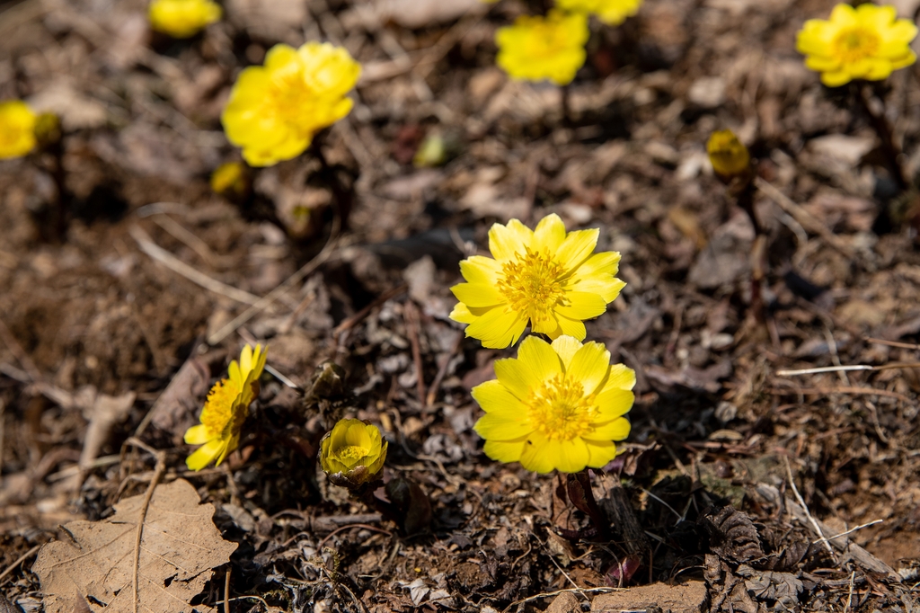 (증평=연합뉴스) 9일 충북 증평군 좌구산에 이른 봄 가장 먼저 꽃망울을 터뜨려 '봄의 전령사', '식물의 난로'라고 불리는 복수초가 만개했다.