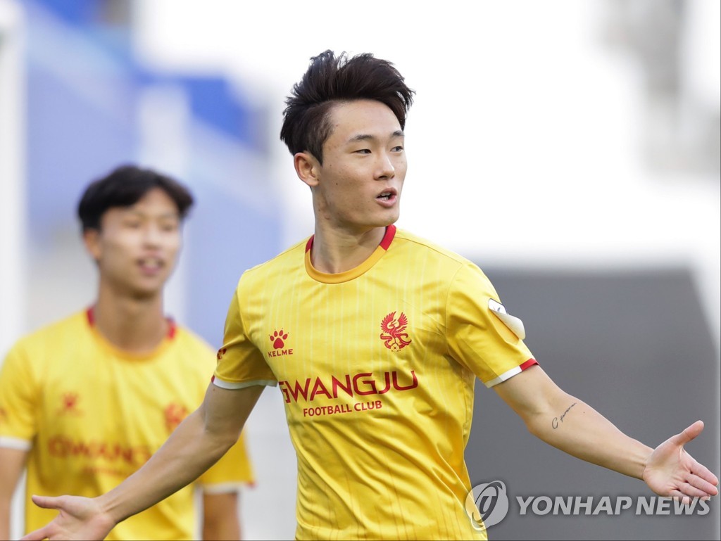 | ▲ In this Oct. 24, 2021, file photo provided by the Korea Professional Football League, Um Won-sang of Gwangju FC celebrates his goal against Suwon FC during a K League 1 match at Suwon Football Stadium in Suwon, some 45 kilometers south of Seoul. (PHOTO NOT FOR SALE) (Yonhap) |