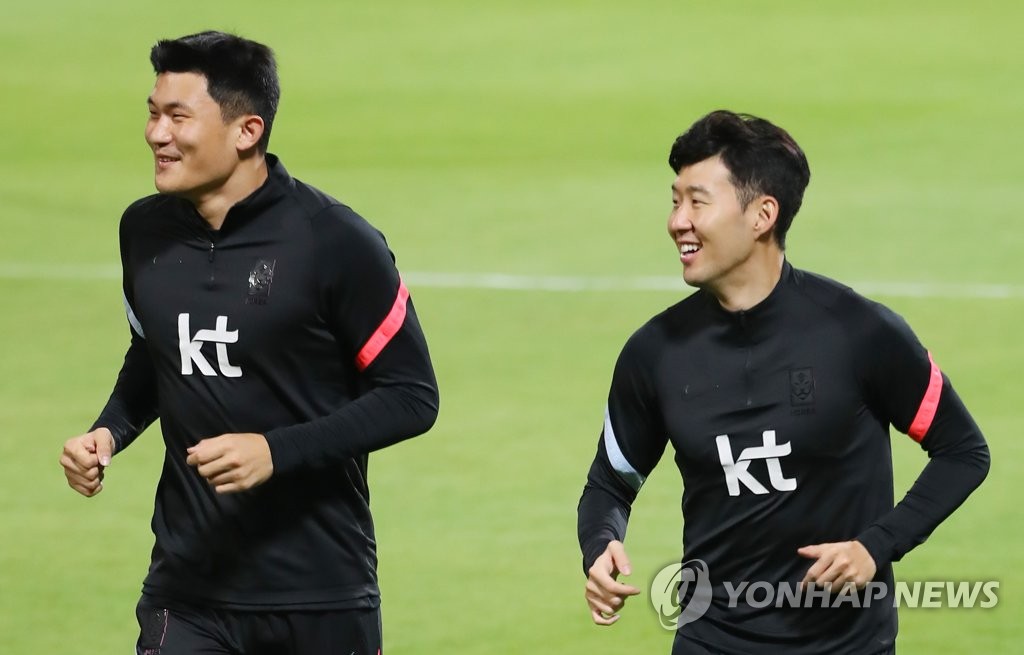 | ▲ 원정 승리 공수의 핵심 손흥민-김민재 (도하=연합뉴스) 김도훈 기자 = 이라크와의 2022 카타르 월드컵 아시아 최종예선전을 위해 카타르 도하에 입성한 축구대표팀 손흥민(오른쪽), 김민재가 14일(현지시간) 알 사일리야 스포츠클럽에서 현지 적응훈련을 하고 있다. 파울루 벤투 감독이 이끄는 축구대표팀은 오는 17일(한국시간) 0시 카타르 도하 타니 빈 자심 스타디움에서 이라크와 2022 카타르 월드컵 최종예선 A조 5차전을 치른다. 2021.11.14 superdoo82@yna.co.kr |