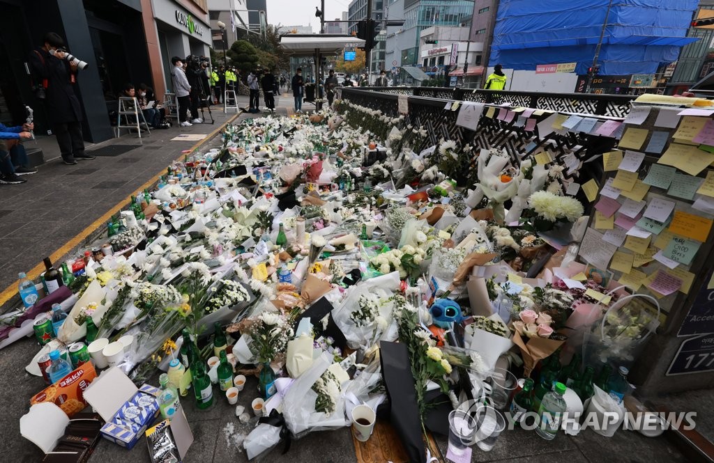 | ▲ 인도 가득 추모의 꽃과 메시지 (서울=연합뉴스) 홍해인 기자 = 1일 서울 용산구 이태원역 1번 출구 앞 참사 추모 공간에 희생자들을 추모하는 꽃과 메시지 등이 놓여 있다. 2022.11.1 hihong@yna.co.kr |