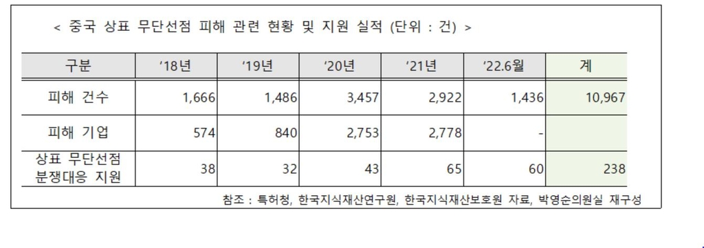 21일 국회 산업통상자원중소벤처기업위원회 소속 더불어민주당 박영순 의원이 특허청 및 산하기관들로부터 받은 국정감사 자료에 따르면 중국에서 외국인 등에 의해 출원·등록된 우리 기업의 K-브랜드 상표 무단 선점 건수는 지난해 2천922건에 달했다.