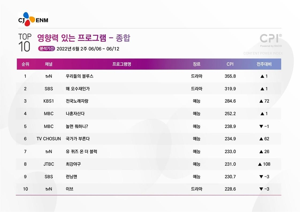 ☞ CPI 지수 = 지상파, 종합편성채널, 케이블 등 29개 채널 프라임 시간대 방송 드라마, 연예·오락, 음악, 인포테인먼트 프로그램을 대상으로 시청자 행동을 파악하는 지표. 방송통신위원회 방송콘텐츠가치정보분석시스템(RACOI)을 통해 주간 단위로 프로그램 관련 시청자 데이터(동영상 조회수, 게시글수, 댓글수)를 수집해 200점 기준 표준점수로 환산해 평균을 산출한다.