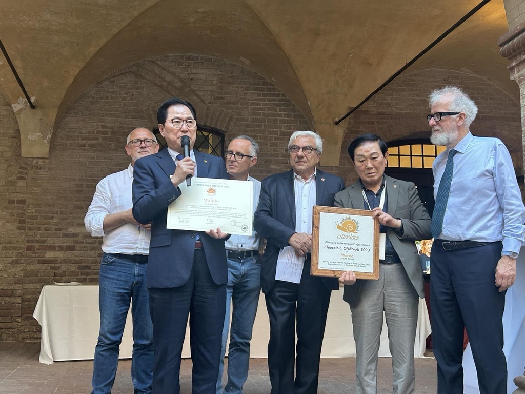 (완도=연합뉴스) 조근영 기자 = 전남 완도군이 지난 24일 이탈리아 파르마에서 열린 '2023 국제 슬로시티연맹 총회'의 국제 슬로시티 우수 사례 콘테스트에서 최고상인 '오렌지 달팽이 상(Chiocciola Orange 2023)'을 받았다.