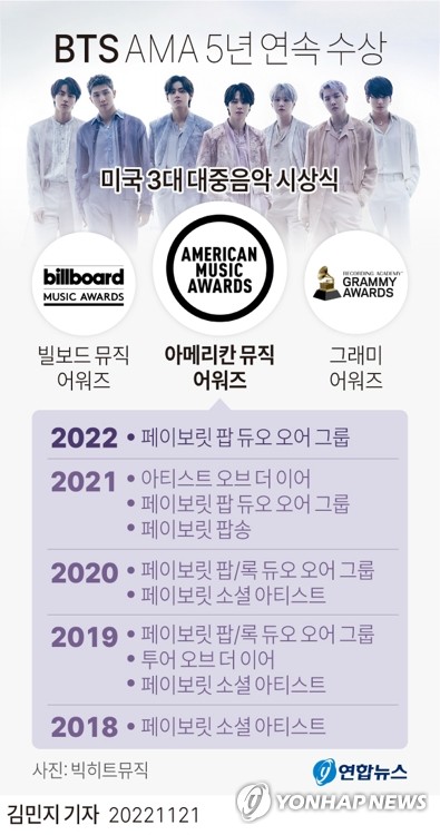 | ▲ [그래픽] BTS 아메리칸 뮤직 어워즈 5년 연속 수상 (서울=연합뉴스) 김민지 기자 = minfo@yna.co.kr 트위터 @yonhap_graphics 페이스북 tuney.kr/LeYN1 |