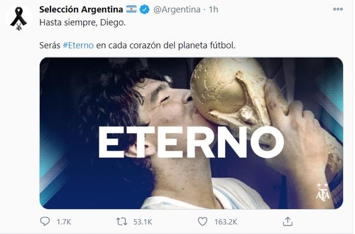 메시는 "아르헨티나 국민과 축구계에 매우 슬픈 날"이라며 "그는 우리를 떠나지만 떠나지 않는 것이기도 하다. 디에고는 영원하기 때문"이라고 썼다.