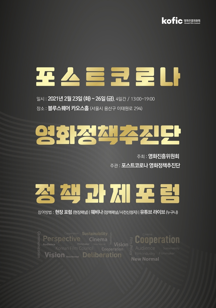 영진위는 신종 코로나바이러스 감염증(코로나19) 확산으로 영화 산업의 근본적인 변화가 진행되고 있는 시점에서 정확한 현안을 체계적으로 반영한 정책 수립을 통해 다양한 변화를 빠르게 수용해 포스트 코로나 시대 한국 영화의 긍정적인 미래를 준비하고자 지난해 9월 '포스트코로나 영화정책추진단'을 구성했다.