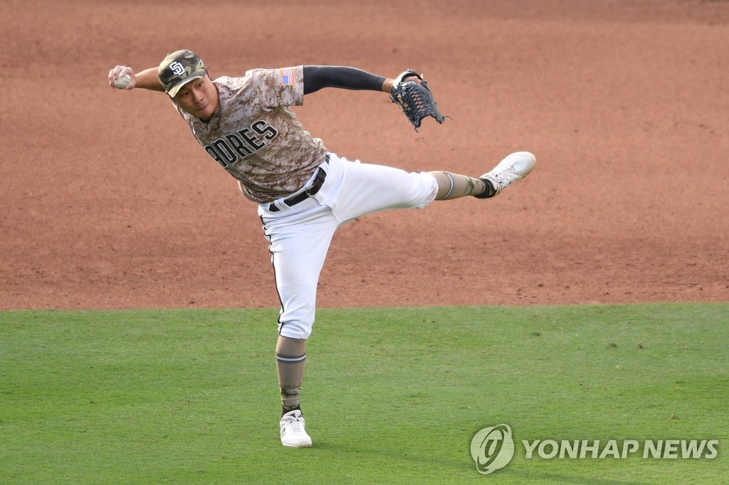 ▲ In this USA Today Sports photo via Reuters, San Diego Padres shortstop Kim Ha-seong makes a throw to first base during the top of the sixth inning of a Major League Baseball regular season game against the St. Louis Cardinals at Petco Park in San Diego on May 16, 2021. (Yonhap)