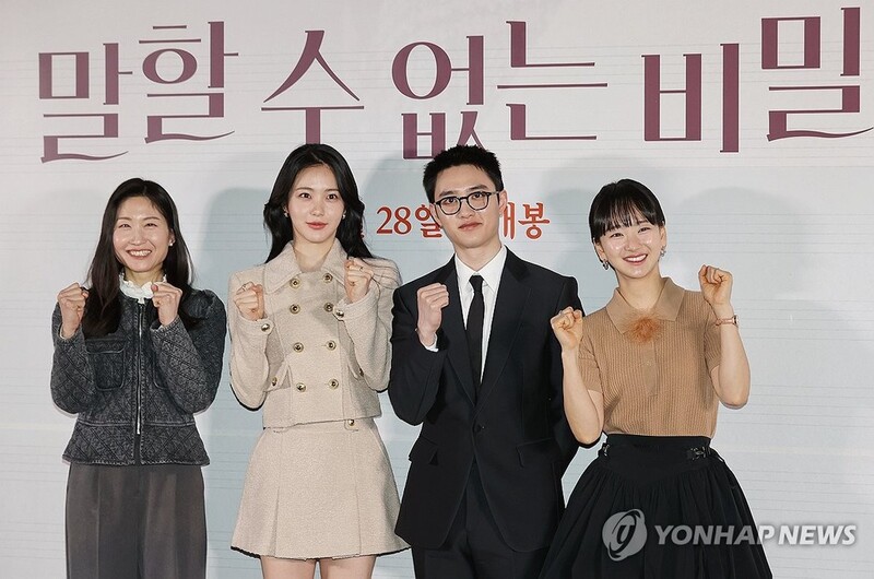 | ▲ '말할 수 없는 비밀' 파이팅! (서울=연합뉴스) 이재희 기자 = 서유민 감독(왼쪽부터), 배우 신예은, 도경수, 원진아가 14일 오후 서울 강남구 메가박스 코엑스점에서 열린 영화 '말할 수 없는 비밀' 시사 간담회에서 포즈를 취하고 있다. 2025.1.14 scape@yna.co.kr |