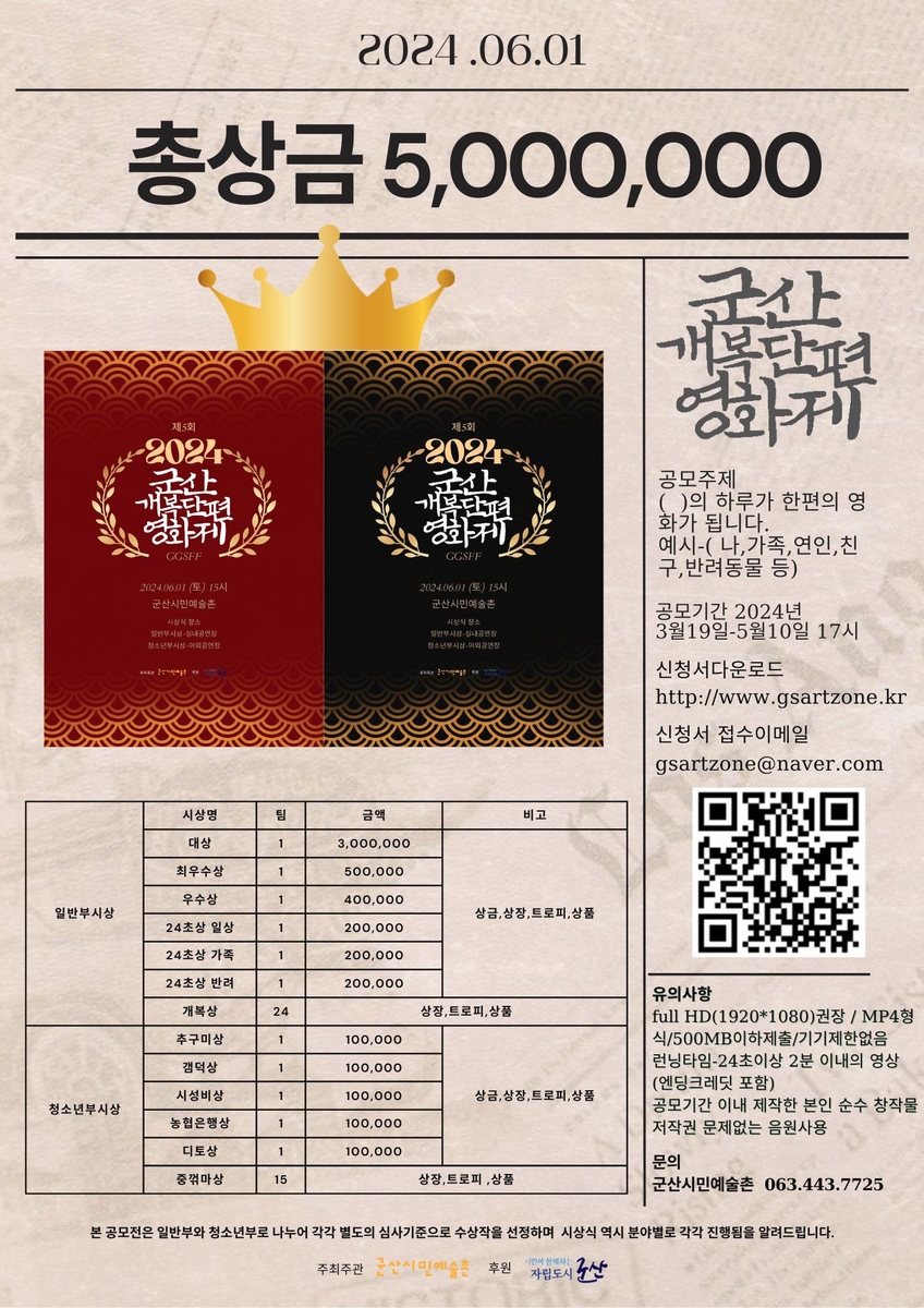 국민 누구나 '당신의 하루가 한 편의 영화가 됩니다'를 주제로 24초에서 2분 이내 길이의 영상물을 제작해 이메일(gsartzone@naver.com)로 보내면 된다.
