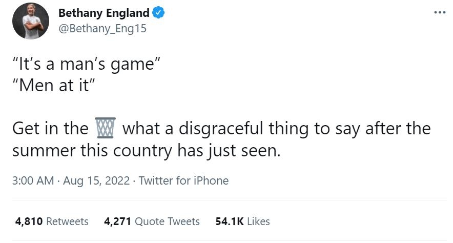 잉글랜드 여자슈퍼리그(WSL)의 첼시 소속으로 이번 여자 유로 우승 주역인 베서니 잉글랜드는 트위터에 "우리나라가 올해 어떤 여름을 보냈는데 정말 수치스러운 발언이다"라며 수네스를 비판했다.