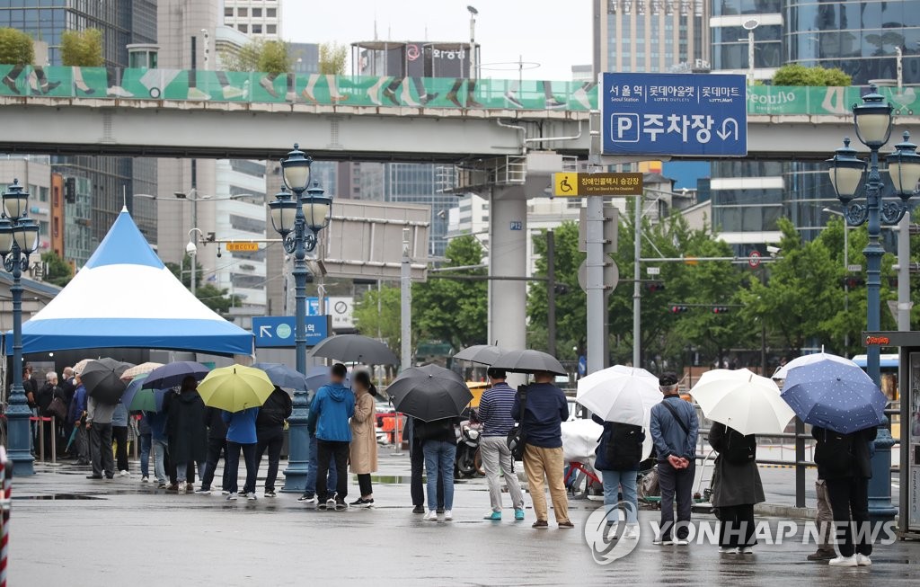 | ▲ People stand in line in the rain to take coronavirus tests at a makeshift clinic in front of Seoul Station on May 21, 2021. (Yonhap) |