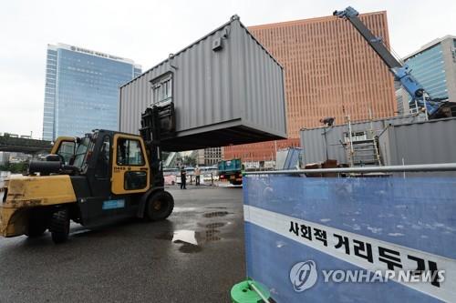 | ▲ Workers remove a container building used as a makeshift clinic for coronavirus tests in front of Seoul Station on July 1, 2022, as South Korea has seen COVID-19 cases decline in recent weeks. (Yonhap) |