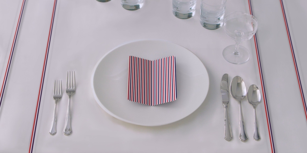 영상은 클래식이 흐르는 고급 음식점에서 식사하는 콘셉트로 구성됐으며, 메인 요리를 열면 톰 브라운 특유의 줄무늬 모양을 한 폴드형 스마트폰 모형이 나타난다.