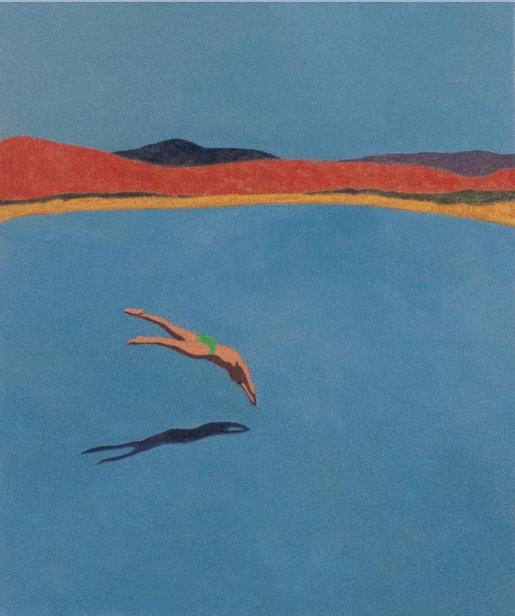 다이빙하는 한 남자의 모습을 그린 유화 'DE CAP'에서는 단순화된 자연의 고요한 정취를 배경으로 인물이 뛰어드는 순간을 표현한다. 담담함이 고독과 조화를 이뤄 역동적이기보다 안정적 느낌을 전한다.