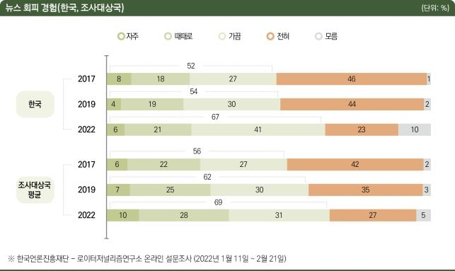 한국을 포함 전체 조사대상 46개국의 뉴스 회피 경험 평균은 69%로 한국보다 다소 높았다.